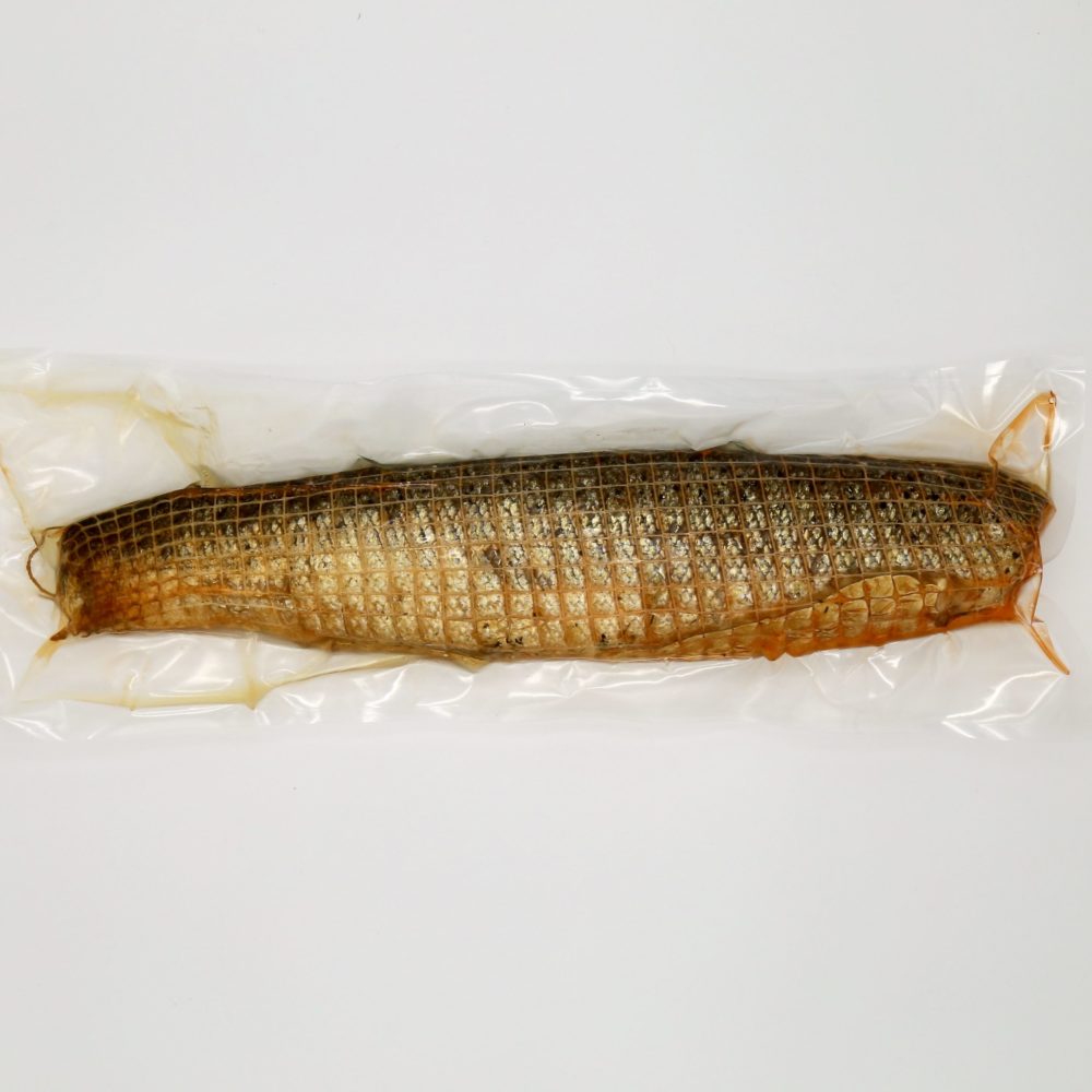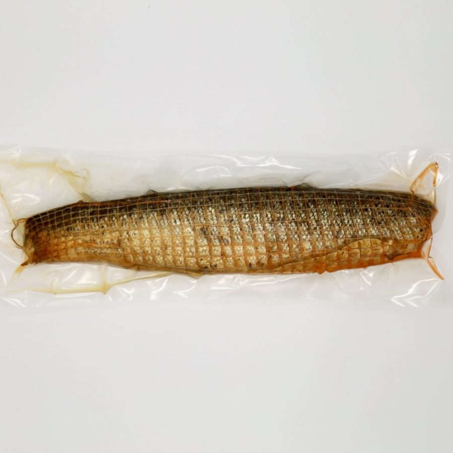 Arrosto di Salmone Affumicato a Caldo intero 2 Kg +, confezionato sottovuoto in busta neutra con presenza di rete attorno al filetto.