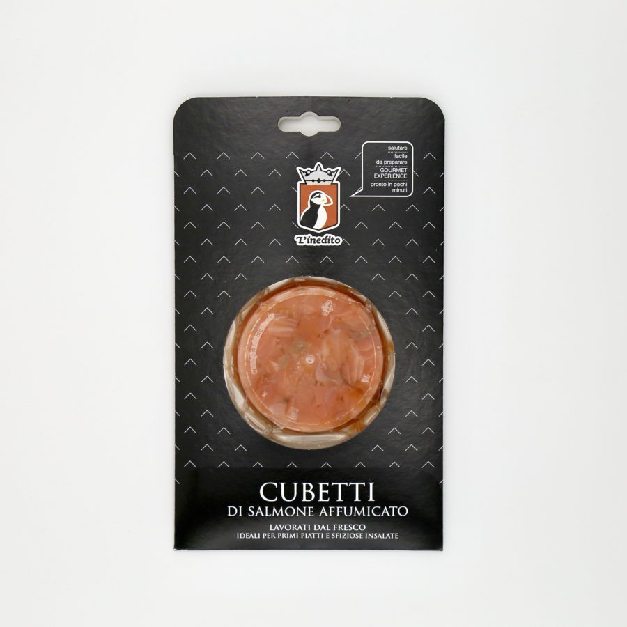 Cubetti di Salmone affumicato 85g, confezionato sottovuoto in coppetta e film neutro ed inserito in astuccio.