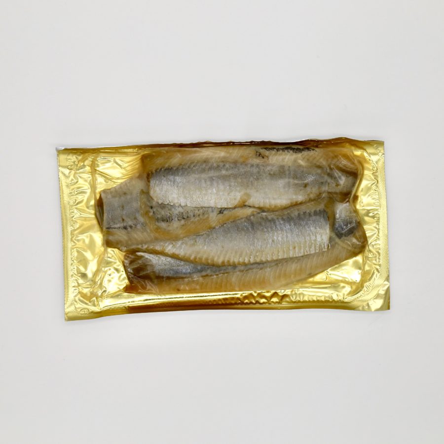Filetti di aringa affumicata – 200g, confezionato sottovuoto in busta neutra e fondo oro.