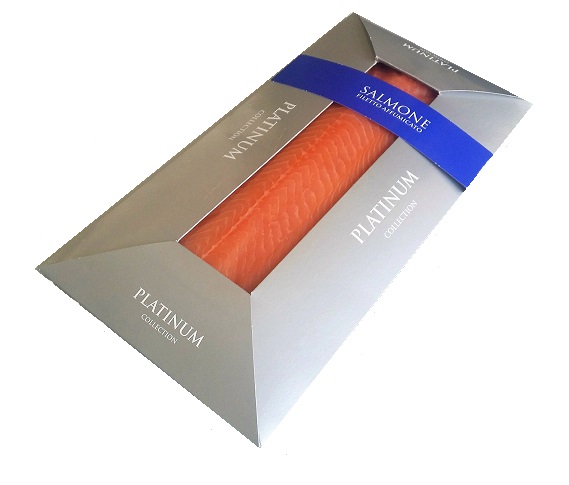 Filetto di Salmone affumicato PLATINUM – 300g, confezionato sottovuoto in busta neutra ed inserito in cofanetto PLATINUM.