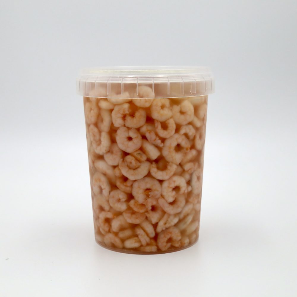 Gamberi boreali in salamoia 900g. Confezionati in vasetti trasparenti con marchio L’inedito.