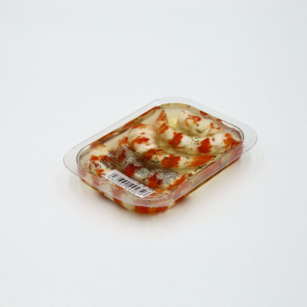 Surimi all’aroma di gambero 200g. Confezionato in vaschette trasparenti con marchio L’inedito.
