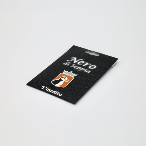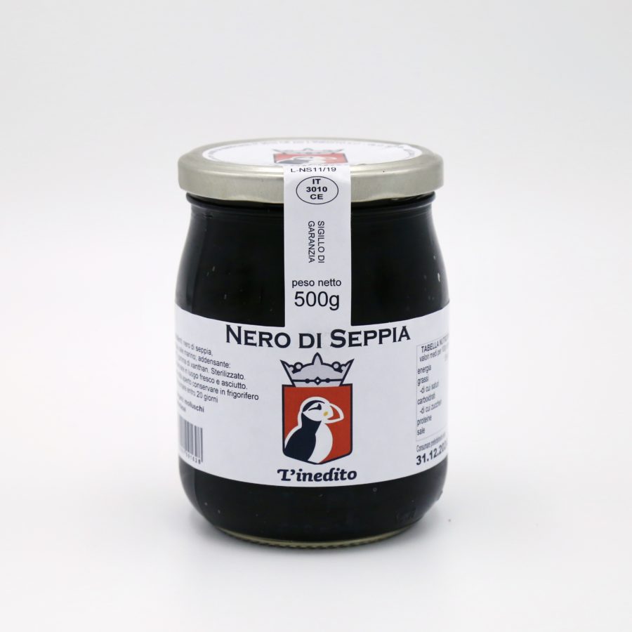 Nero di seppia (Sepia officinalis), confezionato in vasetto con marchio L’inedito.  Prodotto composto per il 75% da nero di seppia, colore nero. Pronto all’uso.