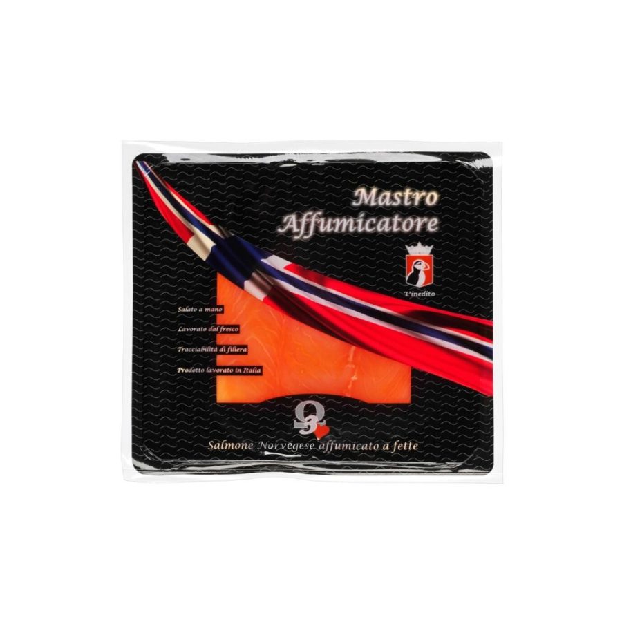 Salmone Norvegese affumicato a fette 150g, confezionato sottovuoto in film stampato con marchio MASTRO AFFUMICATORE. Ottenuto con materia prima fresca proveniente da allevamenti norvegesi certificati.