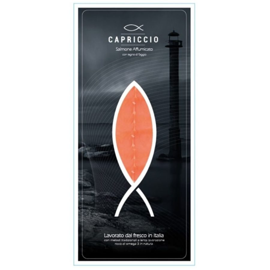Salmone Norvegese affumicato a fette 200g, confezionato sottovuoto in film stampato con marchio CAPRICCIO. Ottenuto con materia prima fresca proveniente da allevamenti norvegesi certificati.