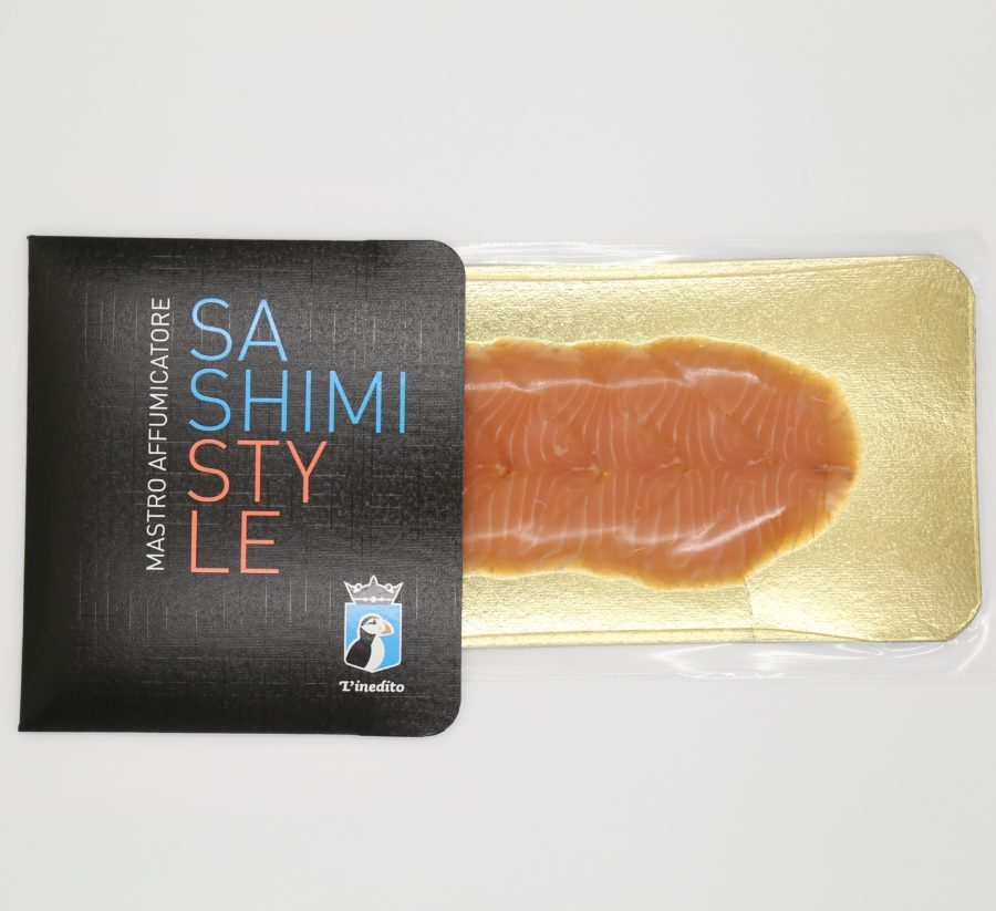Prodotto della pesca trasformato, Salmone Sashimi – 100g, confezionato sottovuoto in busta neutra ed astucciato con cappuccio SASHIMI.