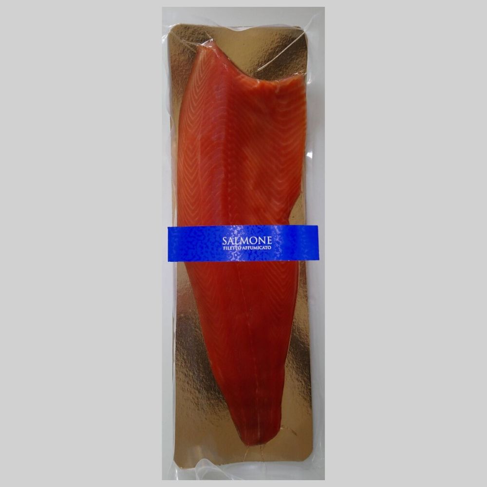 Salmone Scozzese affumicato a fette – peso variabile 900/1400 g. Confezionato sottovuoto in film neutro con aggiunta di fascetta colorata intorno ad ogni singolo pezzo.
