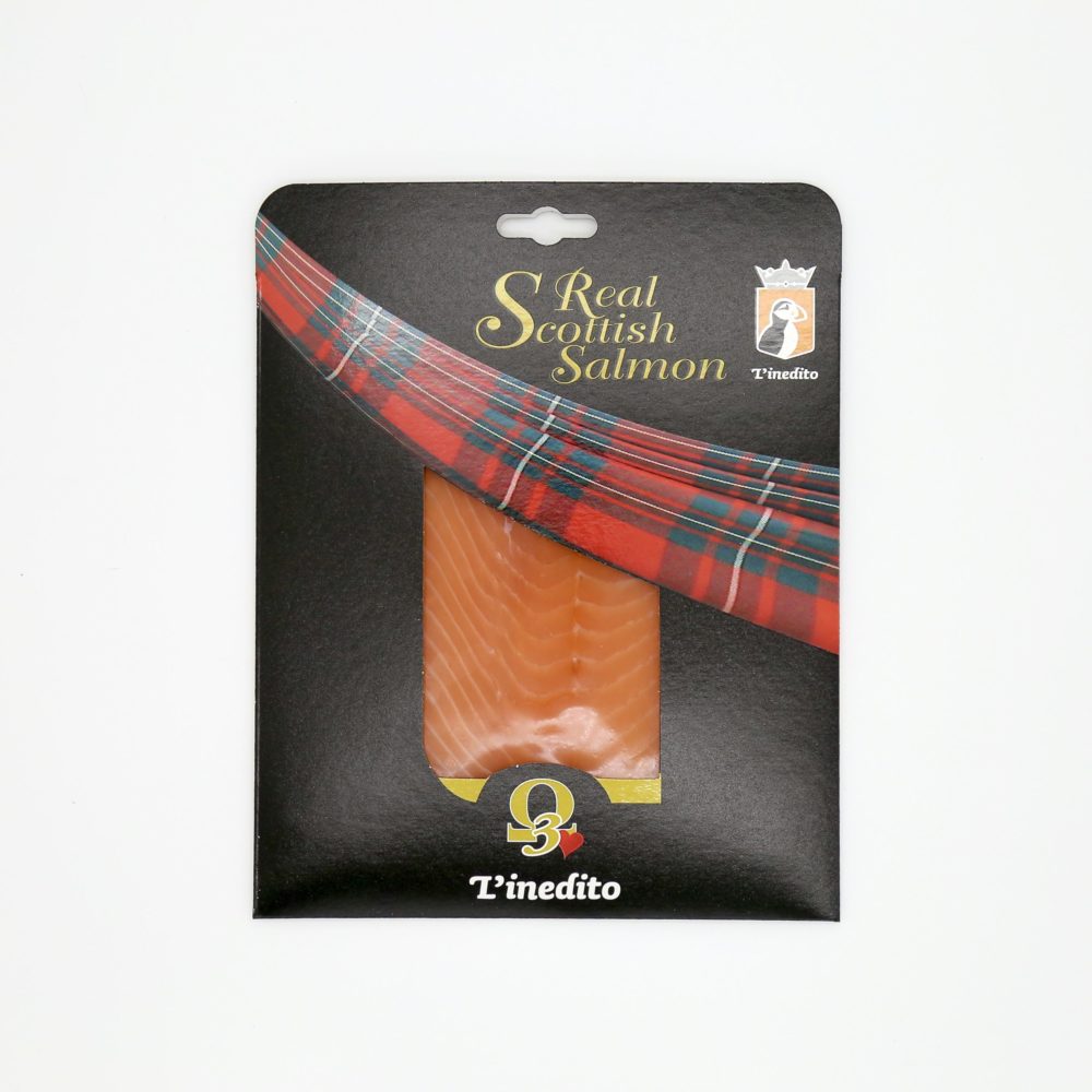 Salmone Scozzese affumicato fetta lunga 100g, confezionato sottovuoto in film neutro ed inserito in astuccio ROYAL.