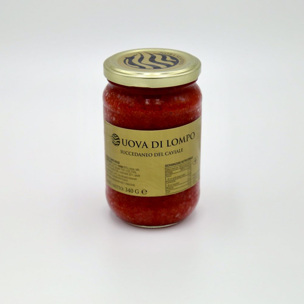 Uova di lompo (Cyclopterus lumpus) rosse, confezionate in vasetti di vetro trasparenti. Succedaneo del caviale, prodotto pronto all’uso.